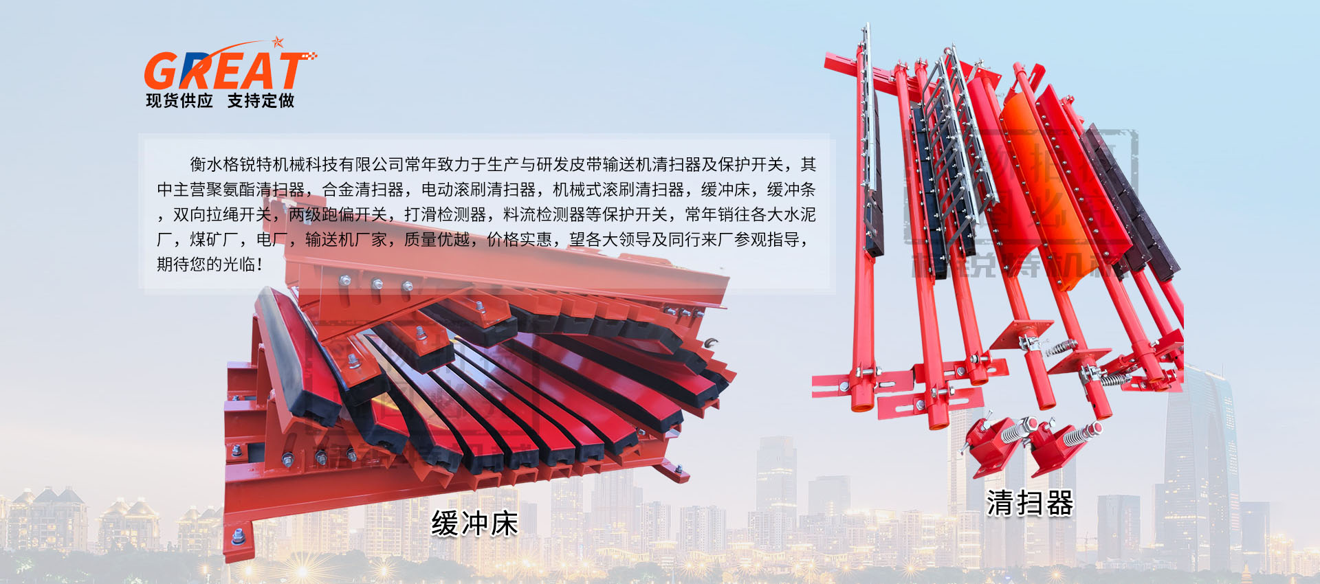 衡水格銳特機(jī)械科技有限公司常年致力于生產(chǎn)與研發(fā)皮帶輸送機(jī)清掃器及保護(hù)開(kāi)關(guān),其中主營(yíng)聚氨酯清掃器,合金清掃器,電動(dòng)滾刷清掃器,機(jī)械式滾刷清掃器,緩沖床,緩沖條,雙向拉繩開(kāi)關(guān),兩級(jí)跑偏開(kāi)關(guān),打滑檢測(cè)器,料流檢測(cè)器等保護(hù)開(kāi)關(guān),常年銷(xiāo)往各大水泥廠(chǎng),煤礦廠(chǎng),電廠(chǎng),輸送機(jī)廠(chǎng)家,質(zhì)量?jī)?yōu)越,價(jià)格實(shí)惠,望各大領(lǐng)導(dǎo)及同行來(lái)廠(chǎng)參觀(guān)指導(dǎo),期待您的光臨!?。?/p>